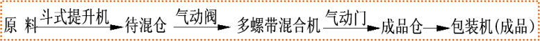 半自動(dòng)生產(chǎn)線,是在節(jié)能型生產(chǎn)線基礎(chǔ)上增加待混倉改進(jìn)而成。主機(jī)由雙軸無重力混合機(jī)換成單軸多螺帶混合機(jī)。其它配套設(shè)備有:斗式提升機(jī)、成 品倉(二次攪拌)、自動(dòng)定量包裝機(jī)(閥口式&敞口式)、鋼架平臺(tái)、空壓機(jī)、氣路系統(tǒng)、電氣控制柜等。