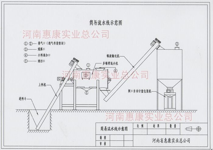 簡易型流水線主要由螺旋上料機、多螺帶混合機、二次提升機、儲料倉、閥口自動定量包裝機等組成。